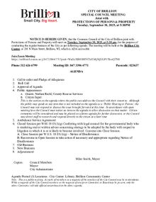 Special Council Joint With Protections of Persons and Property Meeting, Tuesday, September 30, 2025 at 5:30pm. PDF Download "3. 2025 September 30 Special Council Meeting Agenda.pdf"